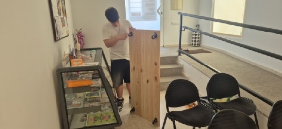 Com o meu filho, adaptando rodas para um móvel na igreja.
